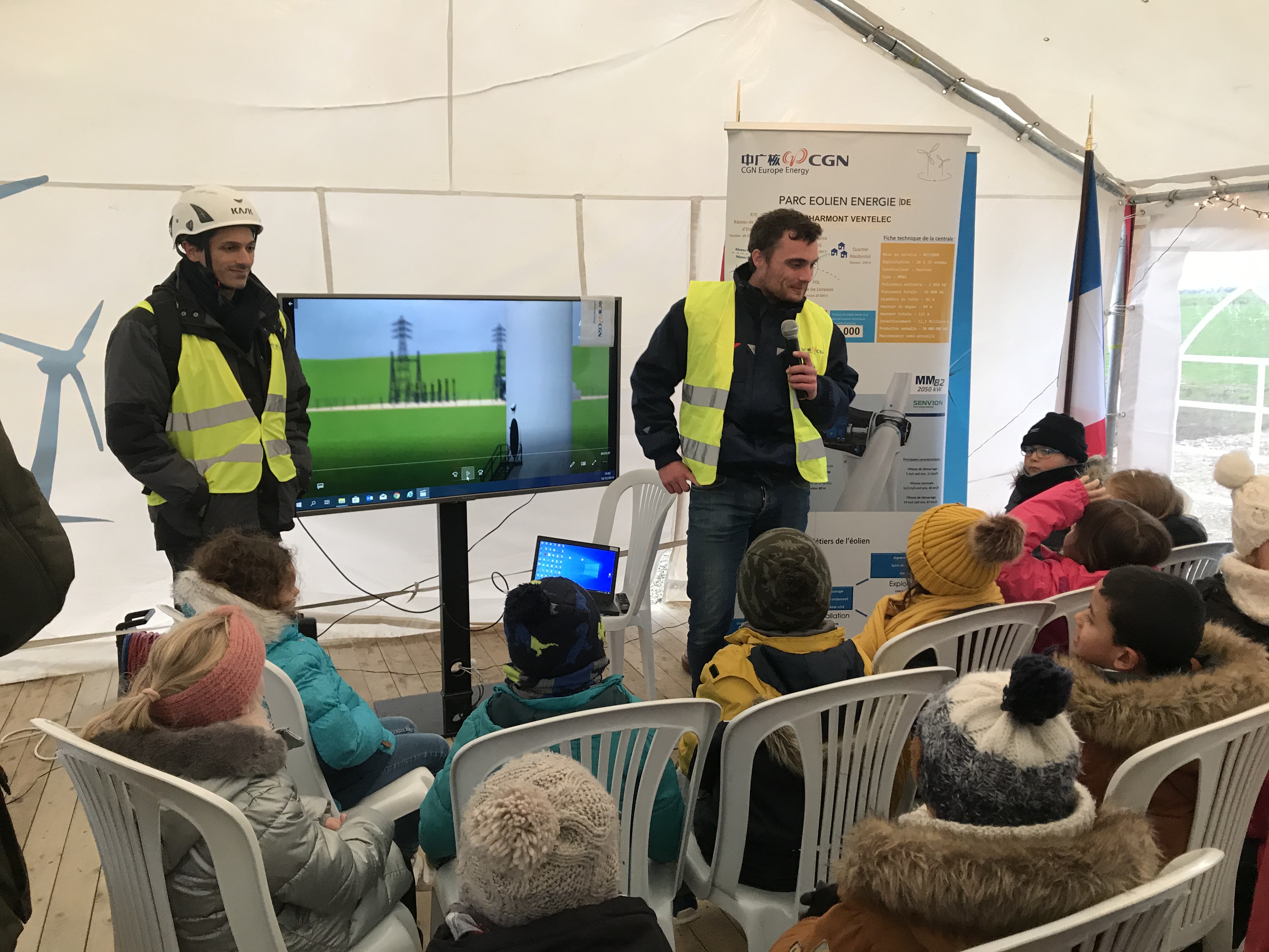 2019年12月,歐能公司舉辦風場開放日,圖為工作人員在為小學生們講解風機運行原理