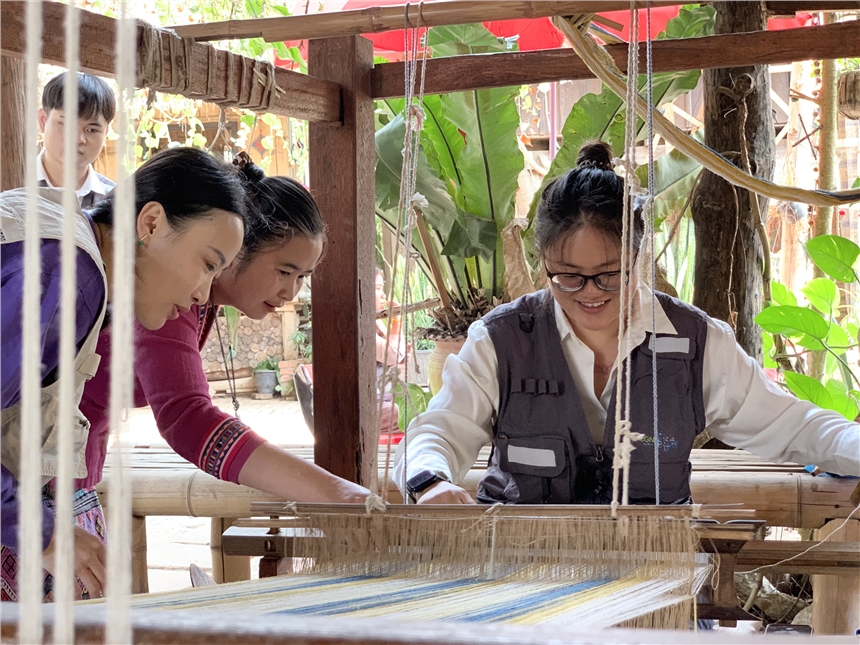 活動現(xiàn)場,她們親身體驗了老撾傳統(tǒng)手工編織技藝。在手藝人的指導下,從采摘棉花開始,逐步完成壓平、卷軸成絲線、編織成布等工序,感受老撾傳統(tǒng)工藝的精妙。